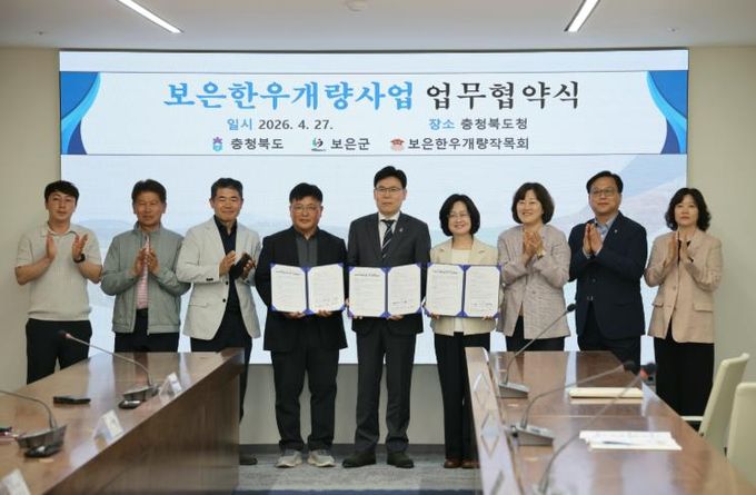 [경남도민뉴스=박만수 기자] 충북 보은군은 27일 충북도청 여는마당에서 충청북도, 보은한우개량작목회와 함께 한우 개량 고도화와 우량 유전자원 확산을 위한 업무협약을 체결하고 보은한우 경쟁력 강화를 위한 추진 기반을 마련했다.