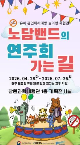 [경남도민뉴스=박민호 기자] 창원특례시 창원과학체험관은 오는 4월 28일부터 7월 26일까지 1층 기획전시실에서 유아 대상 흡연 예방 놀이형 특별전시 ‘노담밴드의 연주회 가는 길’을 개최한다.