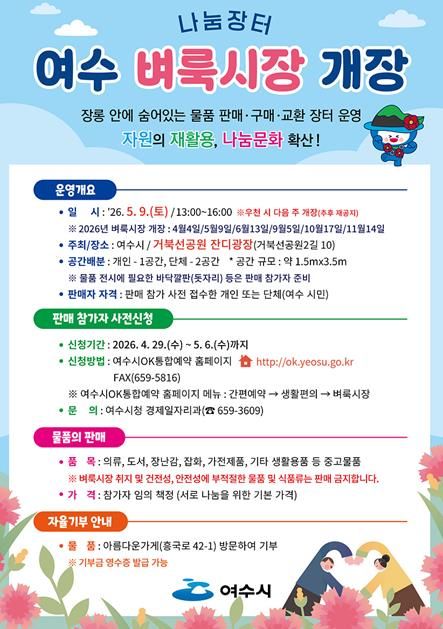 [경남도민뉴스=최인태 기자] 여수시는 오는 5월 9일 오후 1시부터 4시까지 거북선공원 잔디광장에서 ‘2026년 제2차 여수 벼룩시장’을 개최한다고 밝혔다.