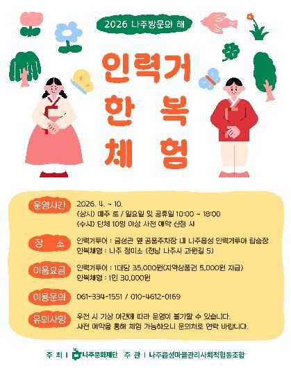 나주문화재단은 ‘2026 나주방문의 해’를 맞아 인력거투어와 한복체험 프로그램을 오는 10월까지 운영한다고 27일 밝혔다.
