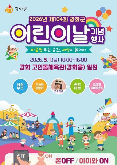 행사장에서는 신체활동 중심의 놀이 프로그램을 비롯해 가수 겸 키즈 크리에어터 서이브 초청공연, 매직&버블쇼, 레크리에이션, 은율탈춤, 강화어린이드럼팀 공연 등 다채로운 콘텐츠가 펼쳐질 예정이다.