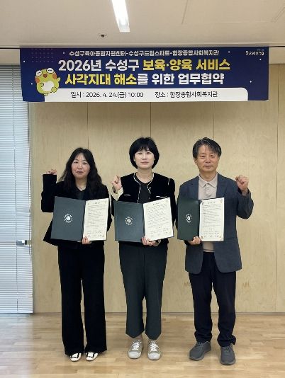 [경남도민뉴스=백상현 기자] 대구 수성구육아종합지원센터(센터장 심영숙)는 지난 24일 수성구 드림스타트센터(센터장 김은미), 함장종합사회복지관(관장 권혁철)과 지역 내 보육·양육 서비스 사각지대 해소를 위한 ‘3자 업무협약(MOU)’을 체결했다고 밝혔다.