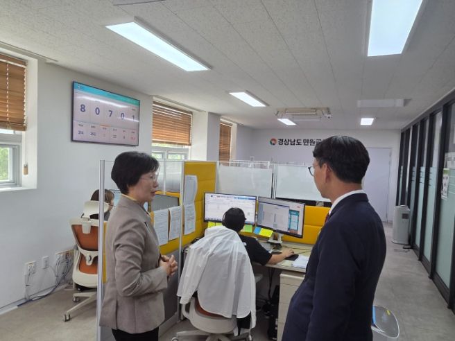 김명주 경남도 경제부지사는 24일 창원시 사림동에 위치한 경남도 민원콜센터를 방문해 운영상황을 점검했다. 경남도 민원콜센터에는 상담원 9명이 근무하고 있으며 일자리, 청년, 보건, 복지 등 797종의 상담 매뉴얼을 갖추고 1일 평균 217건의 민원콜을 처리하고 있다.