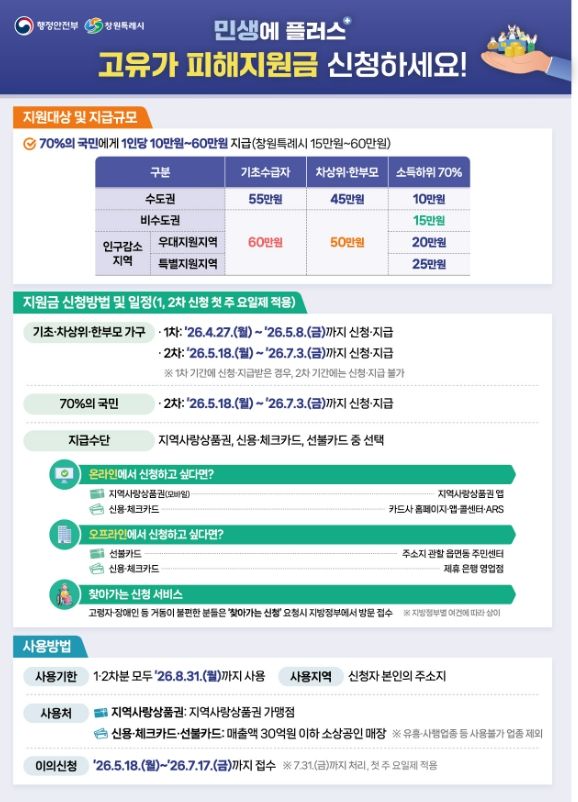 한편, 오는 5월 18일부터 7월 3일까지는 1차 지급대상을 제외한 소득 하위 70% 시민을 대상으로 2차 지원금의 신청·지급이 이어진다. 건강보험료를 활용한 세부 선정 기준(컷오프) 등 구체적인 사항은 5월 중 행정안전부의 별도 지침이 마련되는 대로 확정·안내할 예정이다.
