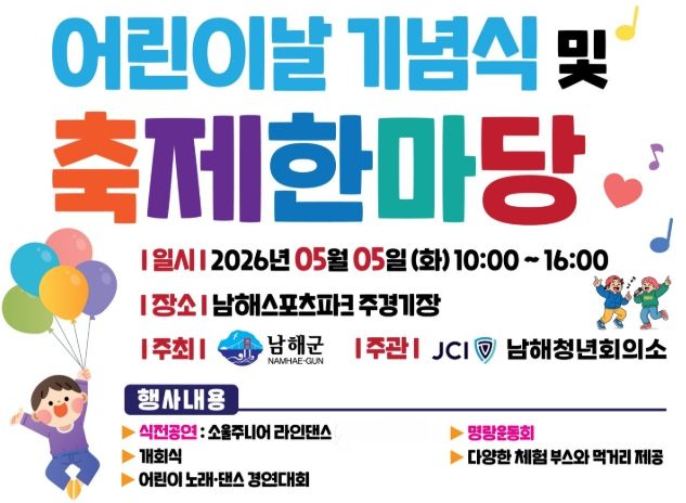 [경남도민뉴스=김부경 기자] 남해군은 5월 5일 어린이날을 맞아 ‘제104회 어린이날 기념식 및 축제한마당’을 남해스포츠파크 주경기장에서 개최한다.