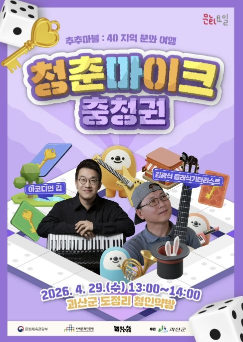 [경남도민뉴스=박만수 기자] 충북 괴산군은 지역 공간과 함께하는 거리공연 ‘청춘마이크’가 오는 29일과 5월 3일 두 차례에 걸쳐 개최된다고 밝혔다.