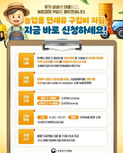 주요내용은 트랙터, 경운기, 콤바인용 면세 경유 및 시설농가 난방용 면세유 가격 인상분의 70%를 지급 단가 한도 내에서 지원 하는 것이 주요 내용 이며 월별 지급 단가는 매월 지역농협에서 확인이 가능하다.