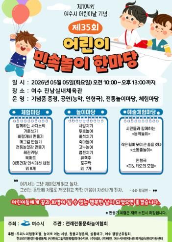 [경남도민뉴스=최인태 기자] 여수시는 제104회 어린이날을 맞아 5월 5일, 아이들이 가족과 함께 전통문화를 즐기며 마음껏 뛰놀 수 있는 민속놀이 놀이 한마당을 개최한다.