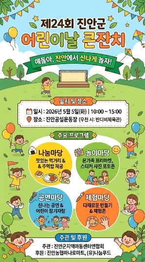 [경남도민뉴스=최인태 기자] 진안군지역아동센터연합회는 제24회 어린이날을 맞아 오는 5월 5일 오전 10시부터 진안공설운동장(우천 시 반다비체육관)에서 ‘어린이날 큰잔치’를 개최한다.