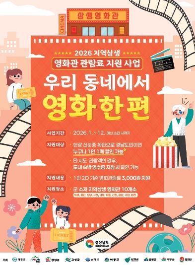 [경남도민뉴스=백형찬 기자] 거창군은 다가오는 5월 가정의 달을 맞이해 군민들의 문화 향유 기회를 확대하고 지역 영화관의 활성화를 돕기 위해 ‘2026년 지역상생 영화관 관람료 지원사업’을 시행한다.