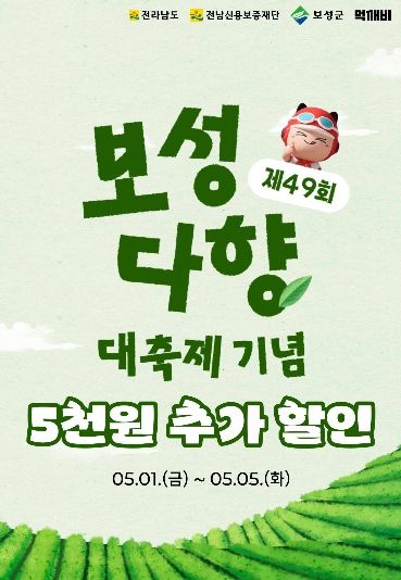[경남도민뉴스=최인태 기자] 보성군은 제49회 보성다향대축제를 맞아 5월 1일부터 5일간 공공배달앱 ‘먹깨비’를 활용한 추가 할인 행사를 진행한다고 밝혔다.