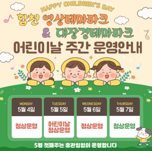 [경남도민뉴스=김춘호 기자] 합천군은 5월 가정의 달을 맞아 5월 첫째 주(5.4.~5.6.)동안 합천영상테마파크와 대장경테마파크를 휴관일 없이 정상 운영한다고 28일 밝혔다.