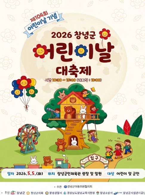 [경남도민뉴스=김병현 기자] 창녕군아동위원협의회는 오는 5월 5일 제104회 어린이날을 맞아 지역 어린이와 가족이 함께 즐길 수 있는 ‘2026년 창녕군 어린이날 대축제’를 창녕군민체육관 광장에서 개최한다고 밝혔다.