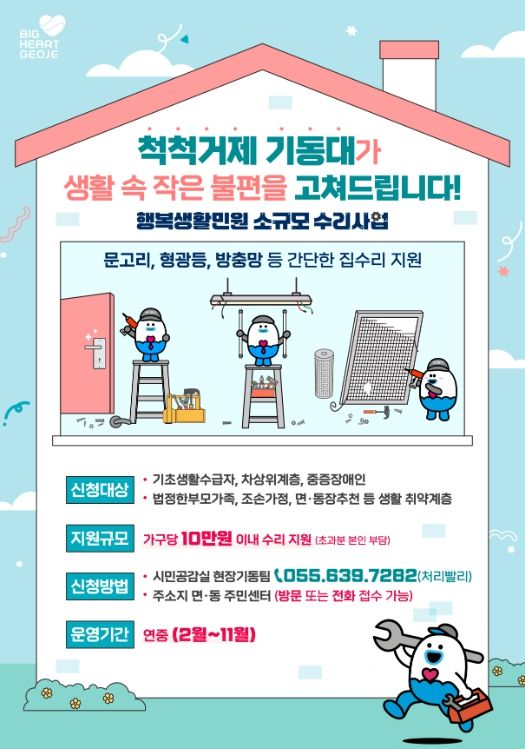 한편, 거제시가 추진 중인 ‘행복생활민원 소규모 수리사업’은 취약계층을 대상으로 전등, 문손잡이 교체 등 가정 내 소규모 수리를 지원하는 생활밀착형 서비스로, 주민 체감도가 높은 대표적인 현장 행정으로 자리 잡고 있다.