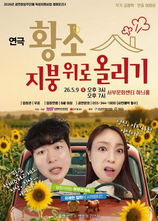 [경남도민뉴스=최미정 기자] (재)김해문화관광재단 김해서부문화센터는 경남문화예술진흥원이 주관하는 ‘2026 공연장상주단체 육성지원사업’에 선정되어, 오는 5월 9일 두 번째 레퍼토리 공연 연극 '황소, 지붕위로 올리기'를 선보인다.