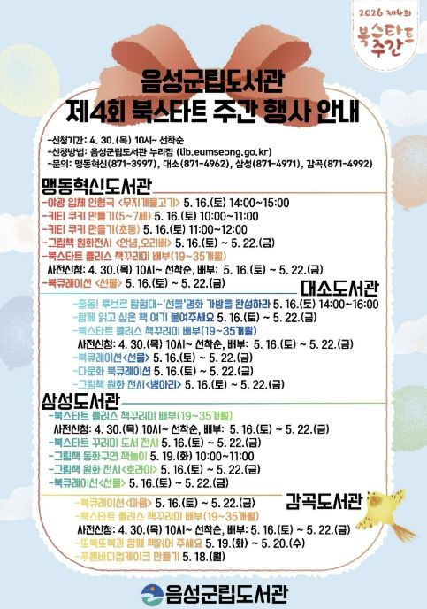 [경남도민뉴스=박만수 기자] 음성군립도서관(맹동혁신·대소·삼성·감곡)은 5월 16일부터 22일까지 ‘북스타트 주간’을 맞이해 영유아와 보호자가 함께 참여할 수 있는 다양한 프로그램을 운영한다.