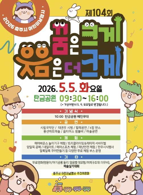 [경남도민뉴스=박만수 기자] 충주시는 오는 5월 5일 오전 9시 30분부터 탄금공원에서 ‘제104회 어린이날’을 기념하는 ‘2026 어린이날 행사’를 개최한다고 밝혔다.