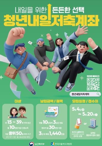 청년내일저축계좌는 저소득 근로 청년이 3년 동안 매월 10만 원을 저축하면 정부가 매월 30만 원의 장려금을 지원하여, 만기 시 본인 저축액의 3배에 달하는 목돈을 마련할 수 있도록 돕는 사업이다.