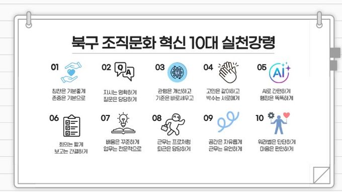 한편, 오는 30일 오후 3시 북구청 3층 회의실에서는 ‘조직문화 혁신을 위한 10대 실천 강령 선언식’이 개최된다.