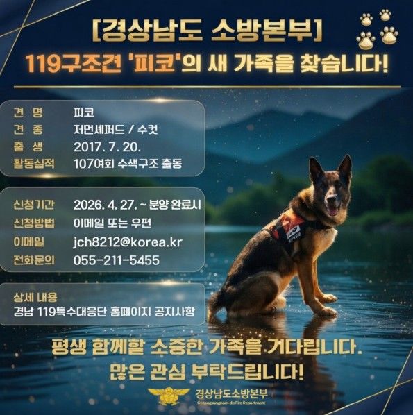 [경남도민뉴스=구인애 기자] 경상남도 소방본부는 각종 재난 현장에서 도민의 생명을 구하기 위해 활약해 온 119구조견 ‘피코’(저먼 셰퍼드, 29kg)가 6년간의 임무를 마치고 명예롭게 은퇴함에 따라, 제2의 견생을 함께할 가족을 찾고 있다고 밝혔다.