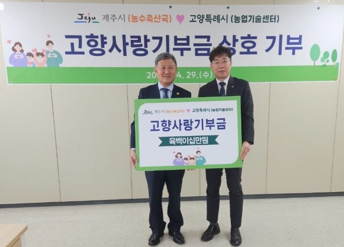 [경남도민뉴스=하형수 기자] 제주시는 4월 29일 고양특례시 농업기술센터에서 고양특례시와 고향사랑기부금 상호 전달식을 갖고 지역 간 상생과 협력 강화에 뜻을 모았다.