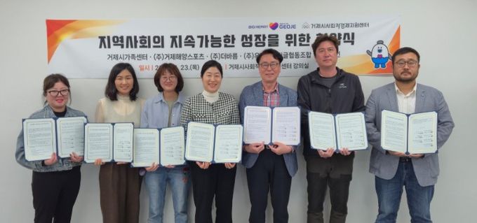 센터는 이날 거제시사회적경제지원센터에서 사회적기업 ㈜거제해양스포츠를 비롯해 ㈜더바름, 예비사회적기업 ㈜우리는, 밍글협동조합, 카페잠언 등 총 6개 기관과 업무협약을 체결했다.