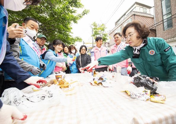 박 구청장은 이날 한남동 주민센터를 시작으로 카페거리 일대에서 주민 70여 명과 함께 청소에 참여했다. 특히 매월 클린데이와 함께 진행되는 ‘종량제 봉투 파봉 캠페인’에서 일일 강사로 나서 직접 종량제 봉투를 열어 보이며 분리배출의 중요성을 강조했다.