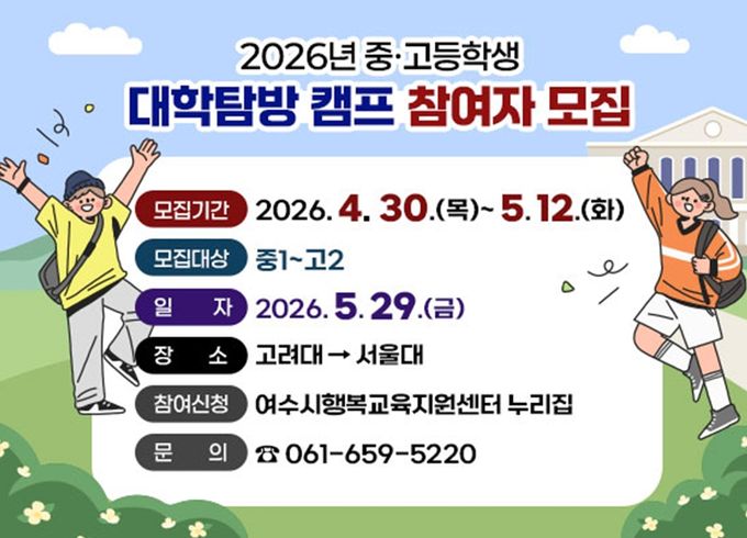 [경남도민뉴스=최인태 기자] 여수시는 오는 30일부터 관내 중학교 1학년부터 고등학교 2학년 학생들을 대상으로 ‘2026년 중·고등학생 대학 탐방 캠프’ 참여자를 모집한다.