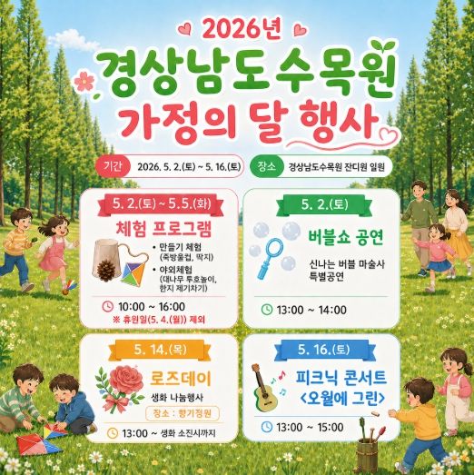 [경남도민뉴스=구인애 기자] 경상남도산림환경연구원은 가정의 달 5월을 맞아 오는 5월 2일부터 16일까지 경상남도수목원 잔디원 일원에서 가족 단위 방문객을 위한 체험·공연·나눔 행사를 운영한다고 밝혔다.
