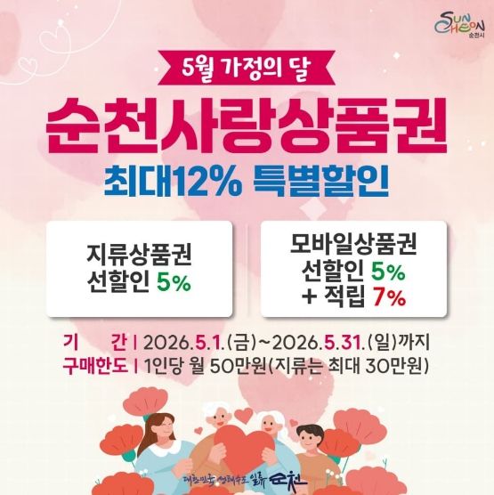 [경남도민뉴스=최인태 기자] 순천시가 5월 한 달간 순천사랑상품권 특별 할인행사를 추진해 시민들의 가계 부담을 덜고 지역 소상공인에게 활력을 불어넣는 소비 촉진에 나선다.