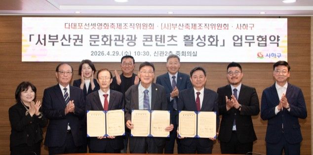 [경남도민뉴스=신석주 기자] 부산 사하구는 서부산권에서 개최되는 축제 및 문화 행사를 중심으로 지역 문화관광 콘텐츠의 발전 가능성을 함께 모색하고 지속가능한 협력 기반을 마련하기 위해 4월 29일 다대포선셋영화축제조직위원회, 부산축제조직위원회와 업무협약을 체결했다고 밝혔다.