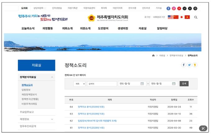 한편, 이상봉 제주특별자치도의회 의장은 “정책 소도리를 통해 최신 입법 정보는 물론 주요 정책 이슈에 대한 도민들의 이해를 높이는 핵심 정보를 제공하고 있다.”라며 “앞으로도 정보의 시의성과 전문성을 높여 나가겠다”고 밝혔다.