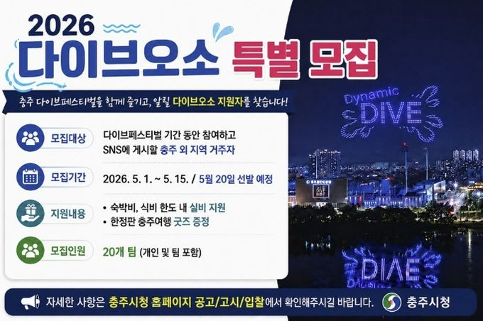 [경남도민뉴스=박만수 기자] 충주시가 ‘2026 충주 다이브 페스티벌 with MyK FESTA’을 맞아 지역 관광의 매력을 널리 알릴 특별 홍보단 ‘다이브 오소(O-SO) 충주’ 참여자를 모집한다고 밝혔다.