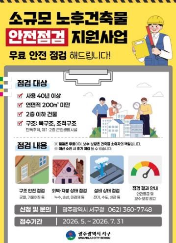 김이강 서구청장은 “안전관리 사각지대에 놓여 있던 소규모 노후 건축물까지 점검을 확대해 주민 불안을 해소하겠다”며 “선제적인 안전점검과 체계적인 사후관리를 통해 생활 속 안전사고를 예방하겠다”고 말했다.