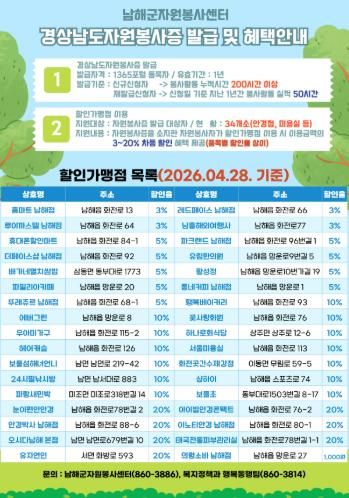 [경남도민뉴스=김부경 기자] 남해군은 경상남도 자원봉사증 발급자를 대상으로 제공되는 할인가맹점 혜택을 확대하기 위해 관내 할인가맹점 10개소를 추가했다고 밝혔다.