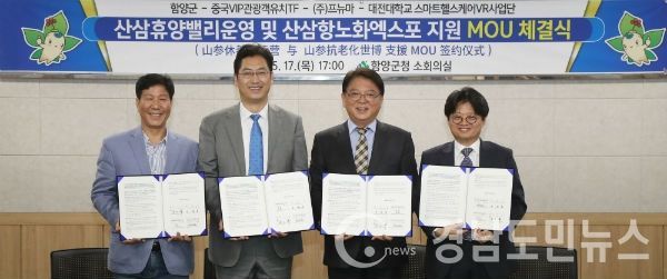 (함양/최병일) = 경남 함양군이 지난 17일 오후 5시 군청 소회의실에서 중국 거대 투자관리 및 유통전문 그룹과 국내 항노화·콘텐츠 전문 업체간 MOU체결식을 갖고 산삼휴양밸리 운영 및 2020함양산삼항노화엑스포의 성공적인 개최에 공동 협력을 약속했다.