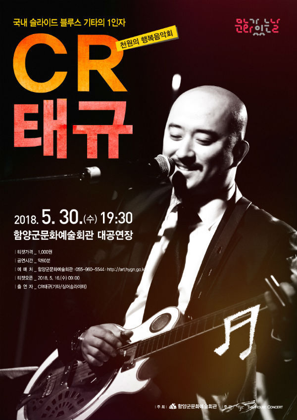 (함양/최병일) = 함양문화예술회관은 5월 마지막 주 수요일인 30일, 문화가 있는 날 천원의 행복음악회 프로그램으로 ‘국내 슬라이드 블루스 기타의 1인자, CR태규’를 준비했다.