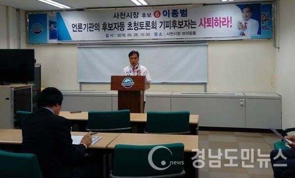 (사천/이형섭 기자) = 무소속 이종범 사천시장 후보는 28일 오전 10시30분 시청브리핑룸에서 기자회견을 열고 후보 정책 토론회를 파기한 '후보는 사퇴하라'고 목청을 높혔다.