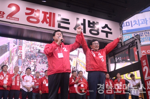 | 지난 3일 자유한국당 서병수 후보와 김무성 후보가 부산 진구 서면 쥬디스태화 일원에서 시민들을 향해 외치고 있다. |