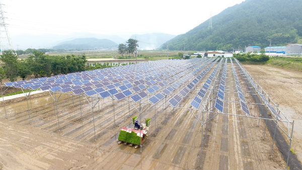 한국남동발전은 지난해 6월 국내 최초로 농업과 신재생에너지가 공존하는 ‘100kW급 계통연계형 영농형 태양광발전’을 경남 고성군 하이면 일대 농지 2,480㎡(약750평)에 준공했고, 9월 추수행사를 시행한바 있다.