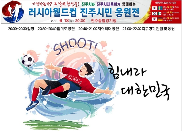 이번 월드컵 응원전은 대한민국 축구대표팀의 선전을 위해 진주시와 진주시 체육회가 주최하는 행사로 지역주민 누구나 참여할 수 있다.