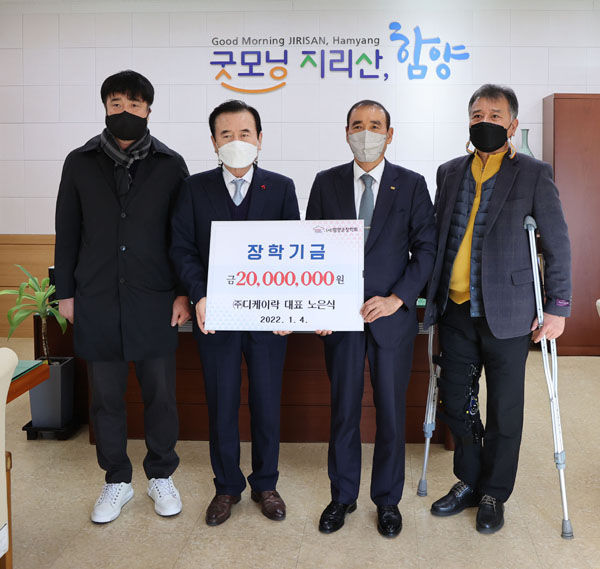 함양군에 따르면 지난 4일 경남 김해 소재 ㈜디케이락 노은식 대표가 고향의 후배들을 위해 2,000만원의 장학금을 함양군장학회에 전달하였다.