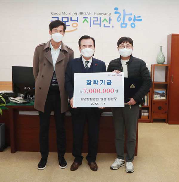 [경남도민뉴스] 지난 4일 함양성심병원 정형주 원장이 700만원의 장학금을 함양군장학회에 전달하였다.