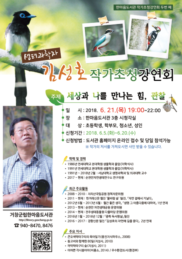 (거창/조현광 기자) = 거창군 한마음도서관은 오는 21일 저녁 7시에 생태과학자로 왕성한 작가로 활동 중인 김성호 박사를 초빙해 ‘세상과 나를 만나는 힘, 관찰’이란 주제로 강연을 한다.
