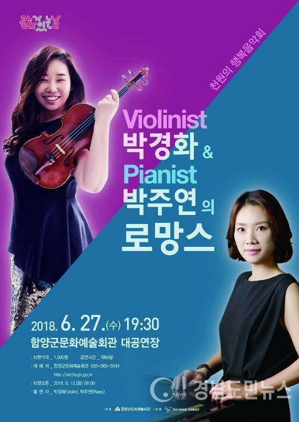 때이른 무더위를 시원하게 식혀줄 이번 음악회에는 Violinist 박경화와 Pianist 박주연의 아름다운 화음을 들려주며 감미로운 힐링의 시간을 제공한다.