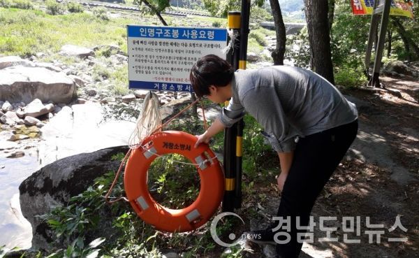 (거창/조현광 기자) = 거창군 북상면(면장 김진태)에서는 때 이른 무더위 속에 피서철이 앞당겨 질 것으로 예상됨에 따라, 여름철 물놀이 안전사고를 사전에 예방하기 위해 지난 20일부터 21일까지 이틀 동안 용암정 등 물놀이 위험지구 8개소에 대해 수영금지 표지판, 구명용 로프, 인명 구조봉 등 안전관리실태를 점검했다.