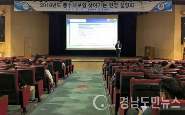 (합천/권연홍 기자) = 합천군(군수 하창환)은 지난 21일 오후 2시부터 합천군 사회복지회관 대강당에서 군청 및 읍·면 담당자, 이장, 지역자율방재단원 등이 참석한 가운데 찾아가는 ‘2018년 찾아가는 풍수해보험 현장설명회’를 개최했다고 26일 밝혔다.