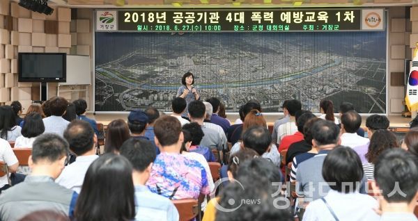 (거창/조현광 기자) = 거창군은 지난 27일 거창군청 대회의실에서 군 소속 전 직원 800여 명을 대상으로 2018년 상반기 공공기관 4대 폭력 예방 통합교육을 진행했다.