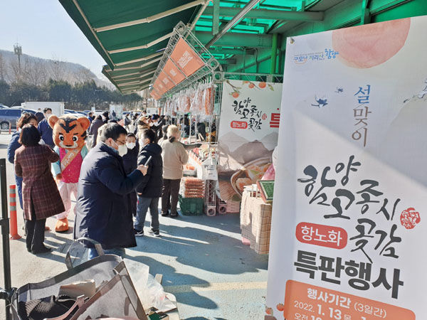 이번 곶감특판은 ‘힐링과 건강의 중심지 함양군’에서 명품 곶감을 생산하는 7개 농가가 참여하였으며, 라이브 커머스, 할인 판매, 증정 이벤트 등 다양한 행사로 인해 첫날 개장식 전부터 사람들이 몰리는 등 북새통을 이뤄 3일간 총 1억 2,000여만원의 판매 실적을 거두었다.