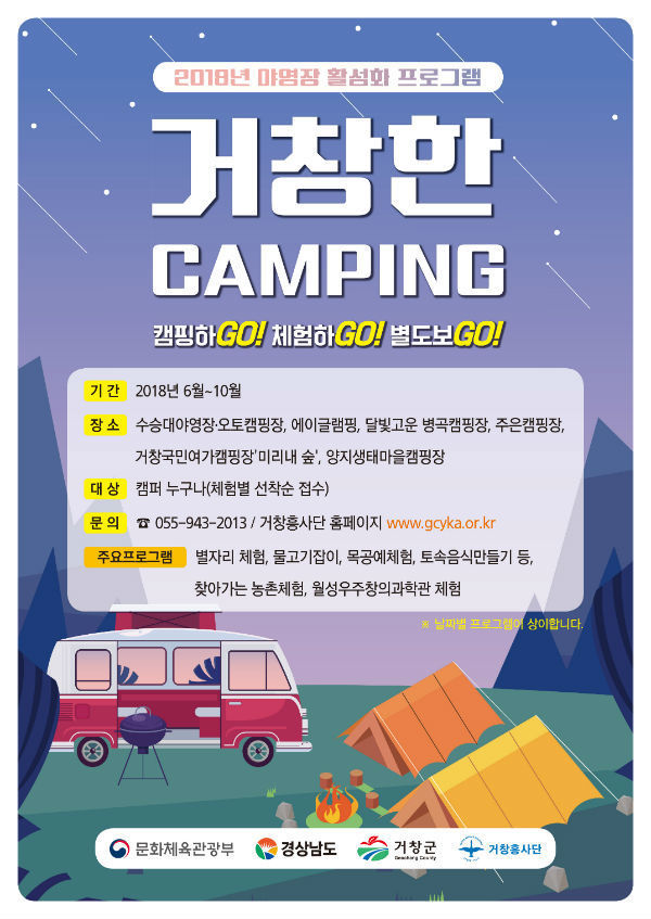 야영장 활성화 프로그램은 새로운 여가문화로 증가하는 야영수요에 부응하고, 야영장과 연계한 다양한 볼거리와 체험거리 제공으로 관광자원으로서의 경쟁력을 높이기 위해 문화체육관광부에서 추진하는 공모사업으로 거창군은 ‘거창한 CAMPING!’이 선정됐다.